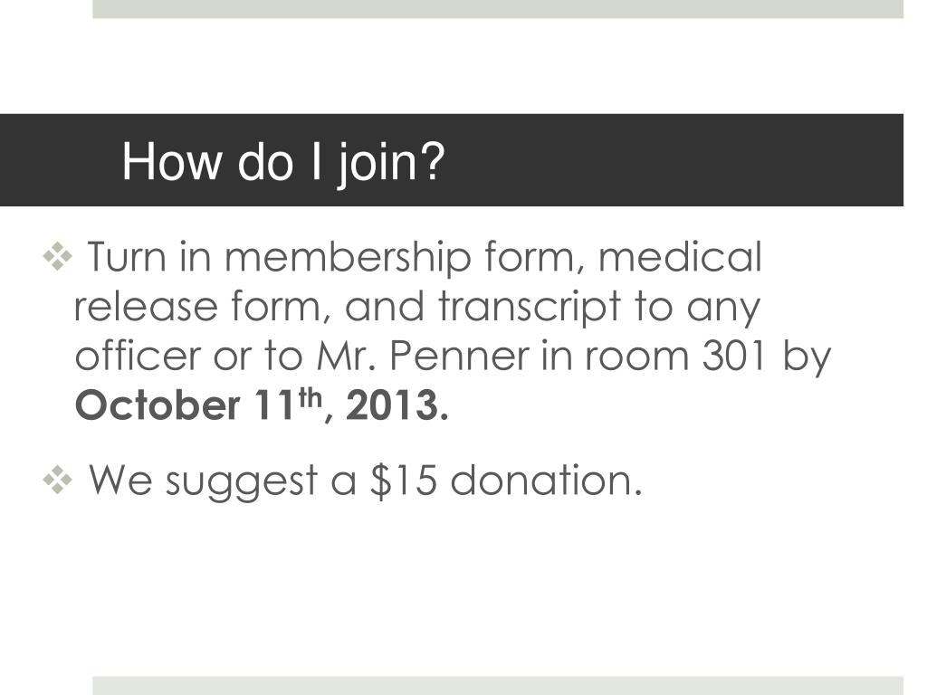 How do I join? • Turn in membership form, medical release form, and transcript to any officer or to Mr. Penner in room 301 by October 11th, 2013. • We suggest a $15 donation.