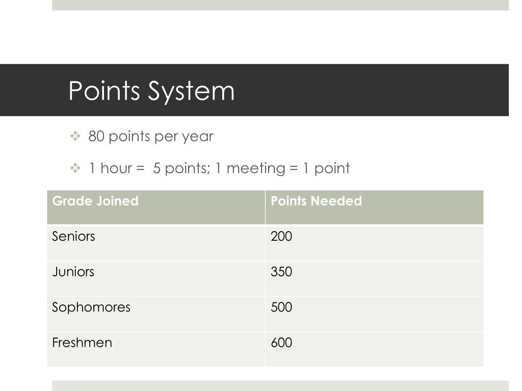 Points System • 80 points per year • 1 hour = 5 points; 1 meeting = 1 point