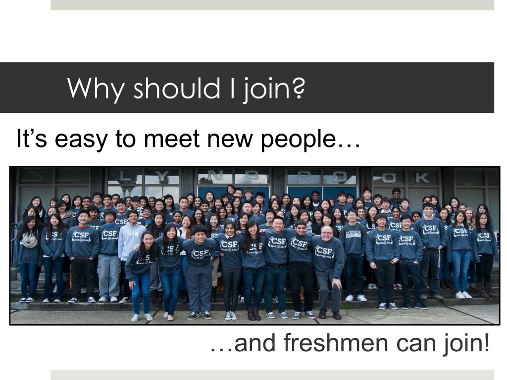 Why should I join? It’s easy to meet new people… …and freshmen can join!