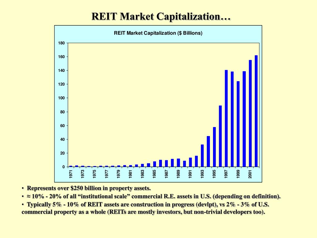 REIT Market Capitalization… • Represents over $250 billion in property assets. • ≈ 10% - 20% of all “institutional scale” commercial R.E. assets in U.S. (depending on definition). • Typically 5% - 10% of REIT assets are construction in progress (devlpt), vs 2% - 3% of U.S. commercial property as a whole (REITs are mostly investors, but non-trivial developers too).
