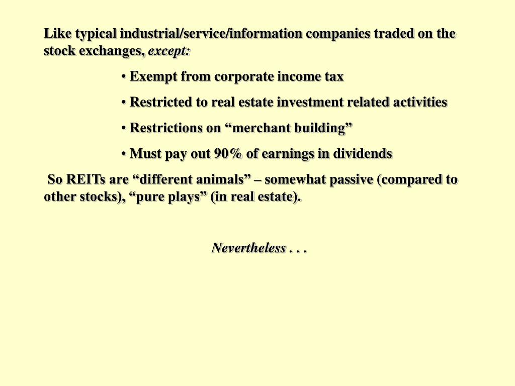 Like typical industrial/service/information companies traded on the stock exchanges, except: • Exempt from corporate income tax • Restricted to real estate investment related activities • Restrictions on “merchant building” • Must pay out 90% of earnings in dividends • So REITs are “different animals” – somewhat passive (compared to other stocks), “pure plays” (in real estate). • Nevertheless . . .