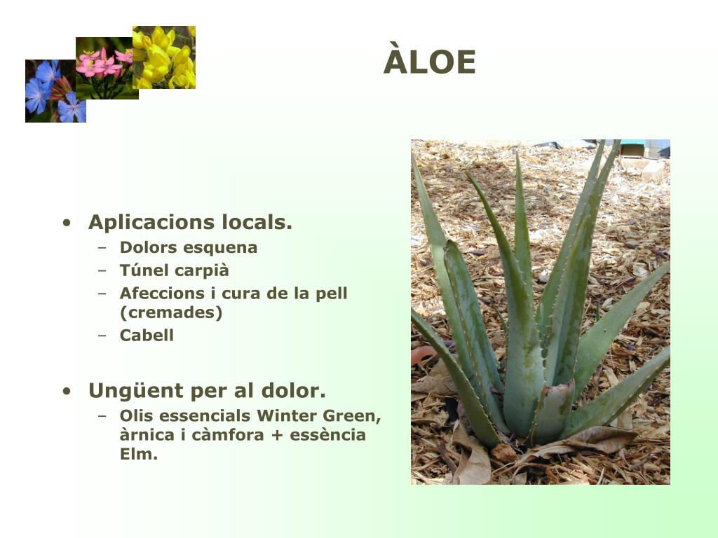 ÀLOE • Aplicacions locals. • Dolors esquena • Túnel carpià • Afeccions i cura de la pell (cremades) • Cabell • Ungüent per al dolor. • Olis essencials Winter Green, àrnica i càmfora + essènciaElm.