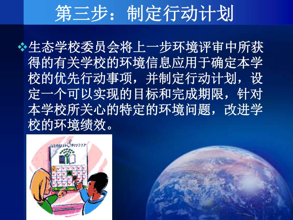 第三步:制定行动计划 生态学校委员会将上一步环境评审中所获得的有关学校的环境信息应用于确定本学校的优先行动事项,并制定行动计划,设定一个可以实现的目标和完成期限,针对本学校所关心的特定的环境问题,改进学校的环境绩效。
