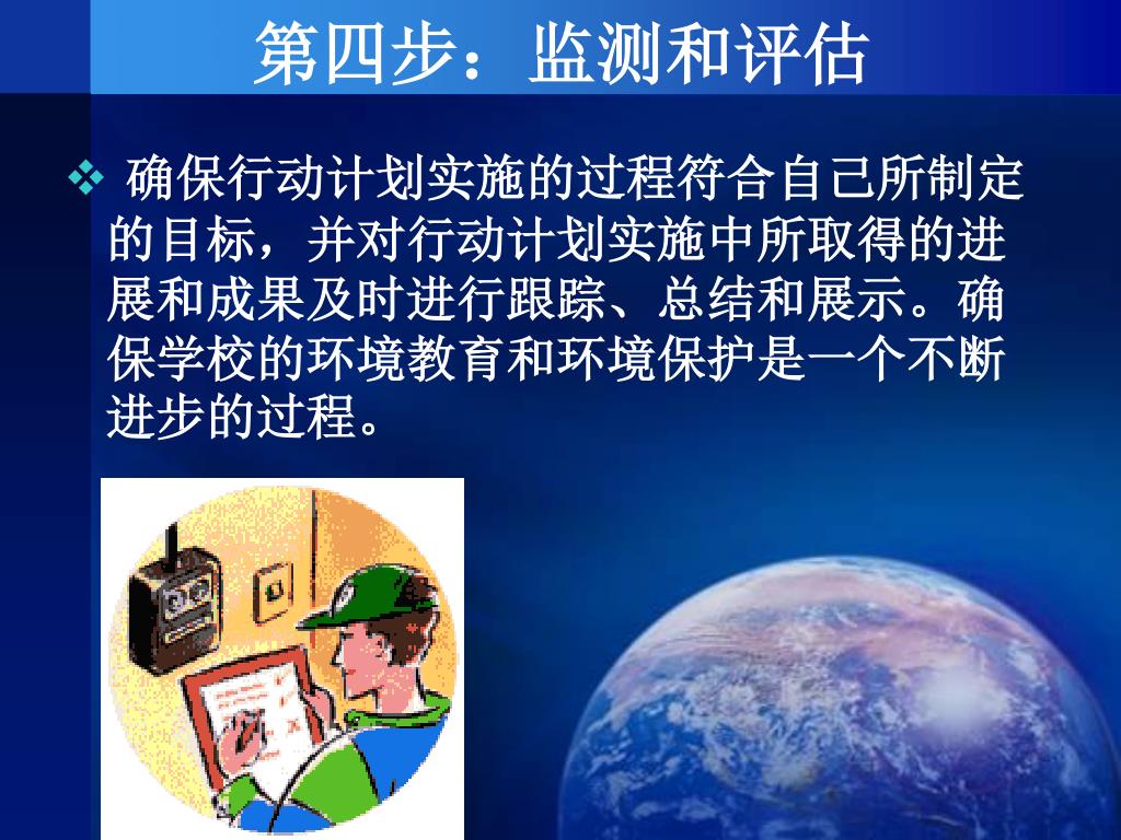 第四步:监测和评估 确保行动计划实施的过程符合自己所制定的目标,并对行动计划实施中所取得的进展和成果及时进行跟踪、总结和展示。确保学校的环境教育和环境保护是一个不断进步的过程。