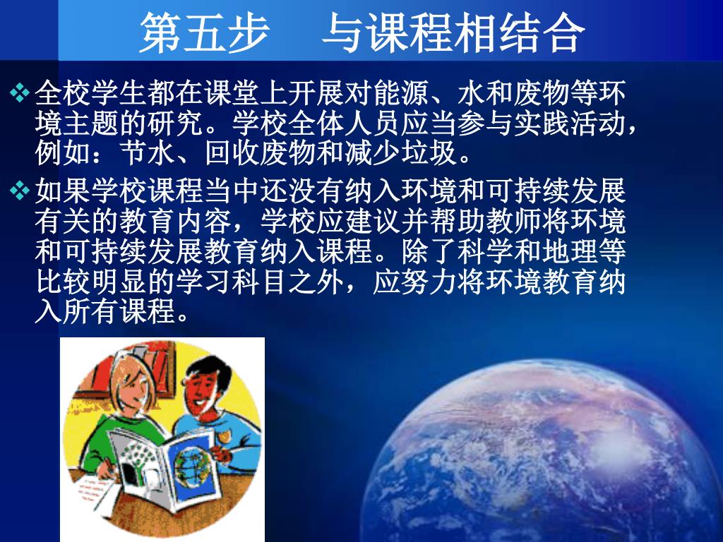 第五步 与课程相结合 全校学生都在课堂上开展对能源、水和废物等环境主题的研究。学校全体人员应当参与实践活动,例如:节水、回收废物和减少垃圾。 如果学校课程当中还没有纳入环境和可持续发展有关的教育内容,学校应建议并帮助教师将环境和可持续发展教育纳入课程。除了科学和地理等比较明显的学习科目之外,应努力将环境教育纳入所有课程。