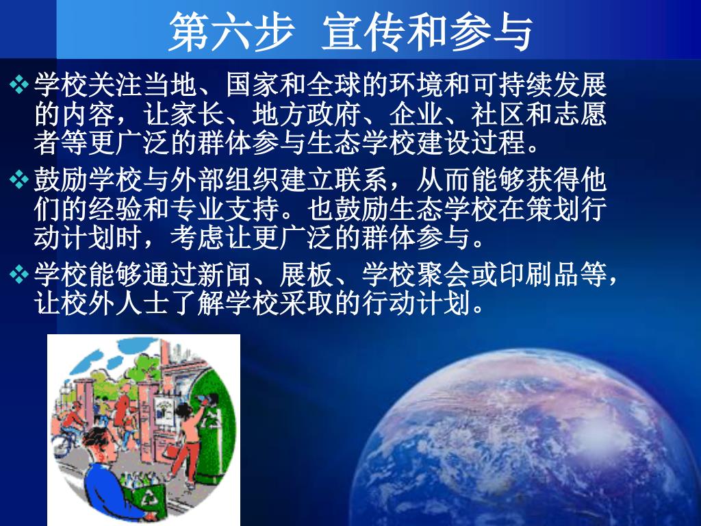 第六步 宣传和参与 学校关注当地、国家和全球的环境和可持续发展的内容,让家长、地方政府、企业、社区和志愿者等更广泛的群体参与生态学校建设过程。 鼓励学校与外部组织建立联系,从而能够获得他们的经验和专业支持。也鼓励生态学校在策划行动计划时,考虑让更广泛的群体参与。 学校能够通过新闻、展板、学校聚会或印刷品等,让校外人士了解学校采取的行动计划。
