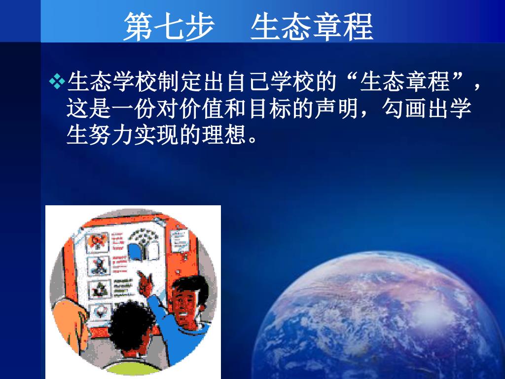 第七步 生态章程 生态学校制定出自己学校的“生态章程”,这是一份对价值和目标的声明,勾画出学生努力实现的理想。