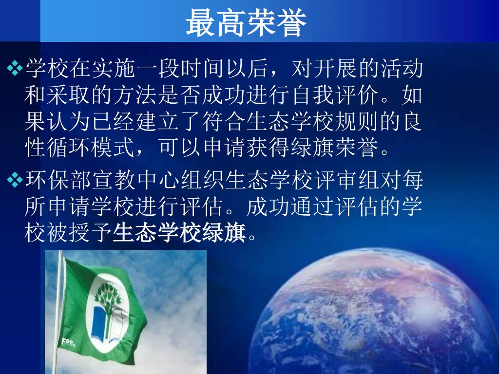 最高荣誉 学校在实施一段时间以后,对开展的活动和采取的方法是否成功进行自我评价。如果认为已经建立了符合生态学校规则的良性循环模式,可以申请获得绿旗荣誉。 环保部宣教中心组织生态学校评审组对每所申请学校进行评估。成功通过评估的学校被授予生态学校绿旗。