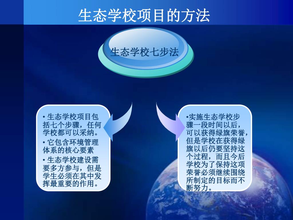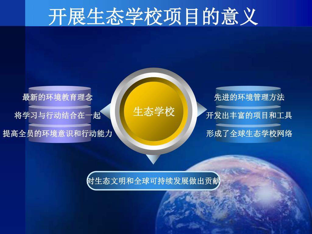最新的环境教育理念 先进的环境管理方法 生态学校 将学习与行动结合在一起 开发出丰富的项目和工具 提高全员的环境意识和行动能力 形成了全球生态学校网络 对生态文明和全球可持续发展做出贡献 开展生态学校项目的意义