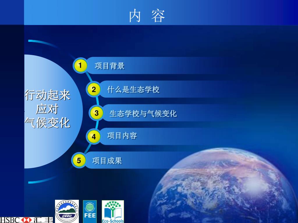 1 项目背景 2 什么是生态学校 行动起来 应对 气候变化 3 生态学校与气候变化 项目内容 4 5 项目成果 内 容