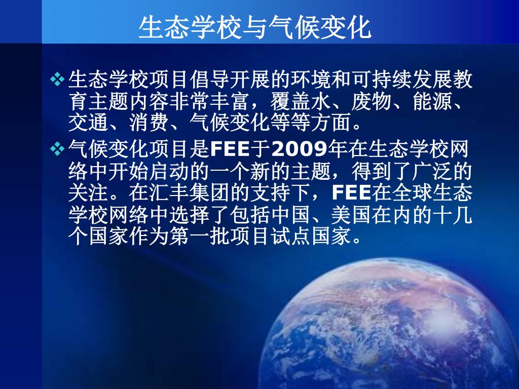生态学校与气候变化 生态学校项目倡导开展的环境和可持续发展教育主题内容非常丰富,覆盖水、废物、能源、交通、消费、气候变化等等方面。 气候变化项目是FEE于2009年在生态学校网络中开始启动的一个新的主题,得到了广泛的关注。在汇丰集团的支持下,FEE在全球生态学校网络中选择了包括中国、美国在内的十几个国家作为第一批项目试点国家。
