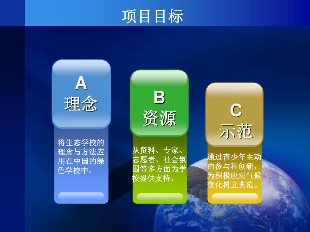 A 理念 B 资源 C 示范 将生态学校的 理念与方法应 用在中国的绿 色学校中。 从资料、专家、 志愿者、社会氛 围等多方面为学 校提供支持。 通过青少年主动 的参与和创新, 为积极应对气候 变化树立典范。 项目目标