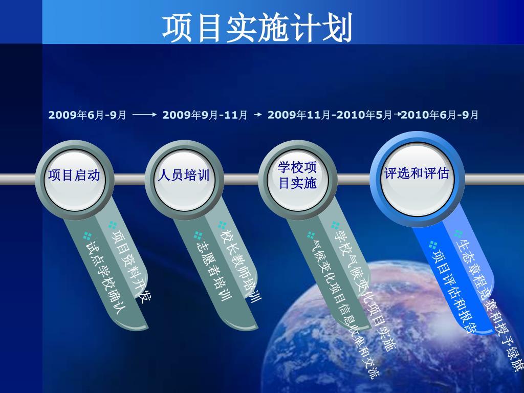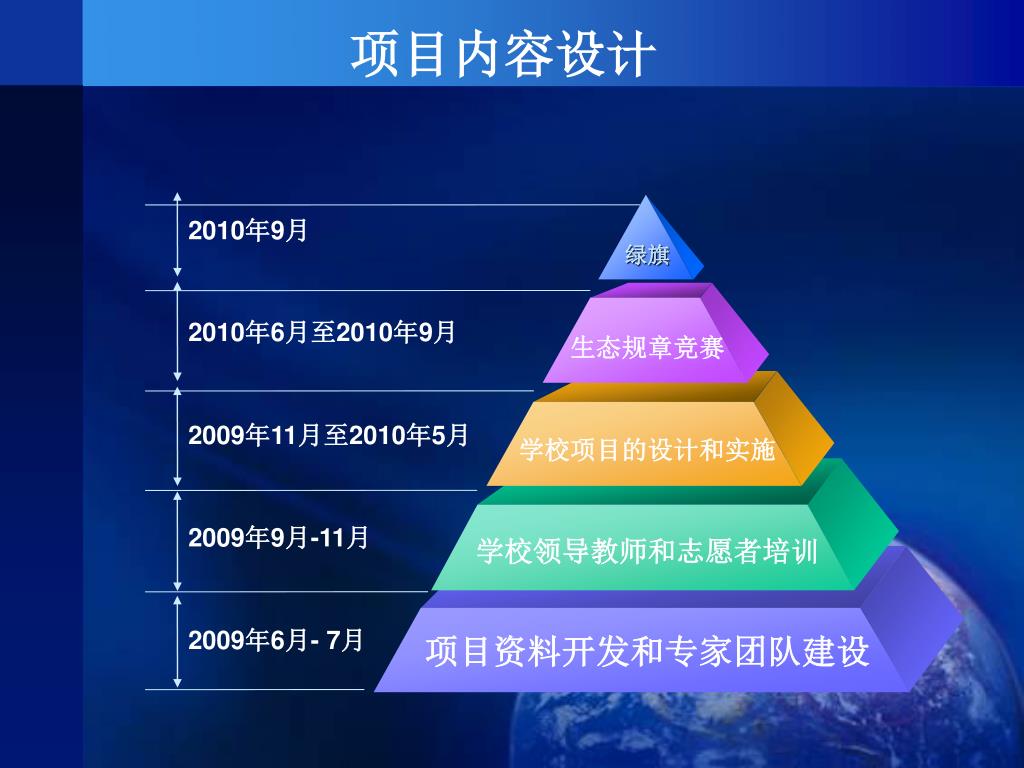 2010年9月 绿旗 2010年6月至2010年9月 生态规章竞赛 2009年11月至2010年5月 学校项目的设计和实施 2009年9月-11月 学校领导教师和志愿者培训 2009年6月- 7月 项目资料开发和专家团队建设 项目内容设计