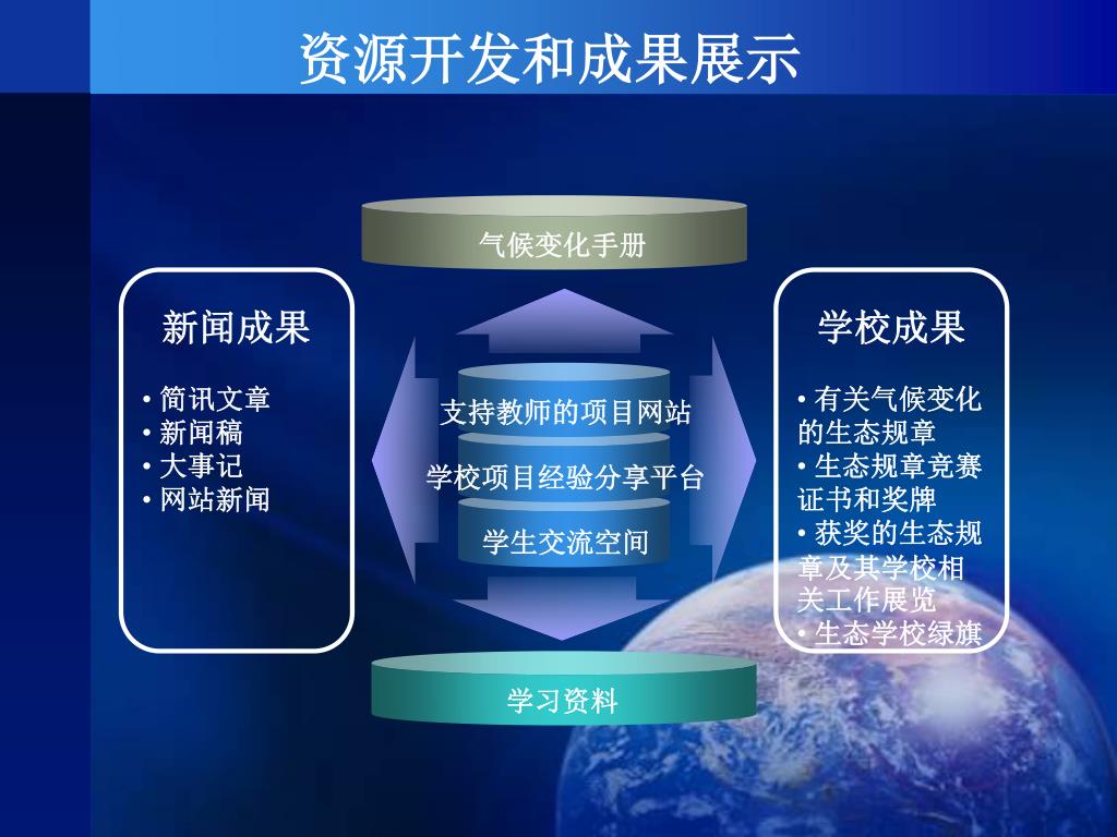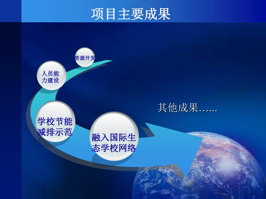 资源开发 其他成果…... 学校节能 减排示范 融入国际生 态学校网络 项目主要成果 人员能力建设