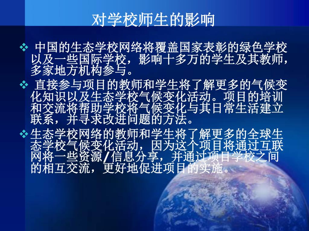 对学校师生的影响 中国的生态学校网络将覆盖国家表彰的绿色学校以及一些国际学校,影响十多万的学生及其教师,多家地方机构参与。 直接参与项目的教师和学生将了解更多的气候变化知识以及生态学校气候变化活动。项目的培训和交流将帮助学校将气候变化与其日常生活建立联系,并寻求改进问题的方法。 生态学校网络的教师和学生将了解更多的全球生态学校气候变化活动,因为这个项目将通过互联网将一些资源/信息分享,并通过项目学校之间的相互交流,更好地促进项目的实施。