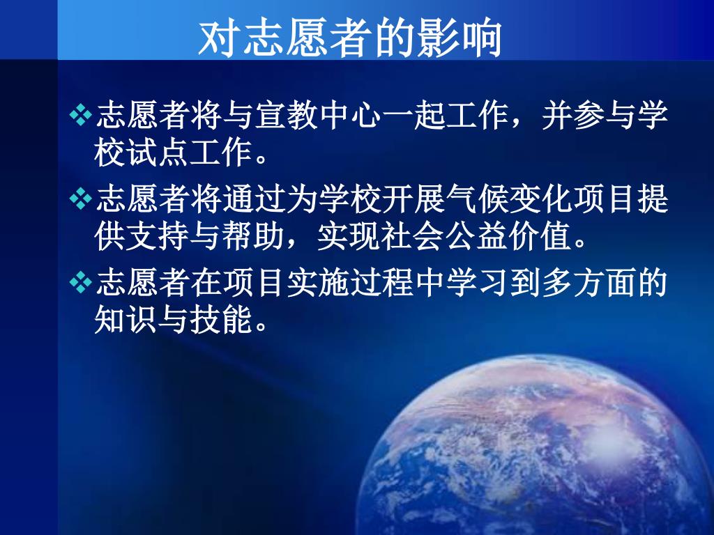 对志愿者的影响 志愿者将与宣教中心一起工作,并参与学校试点工作。 志愿者将通过为学校开展气候变化项目提供支持与帮助,实现社会公益价值。 志愿者在项目实施过程中学习到多方面的知识与技能。