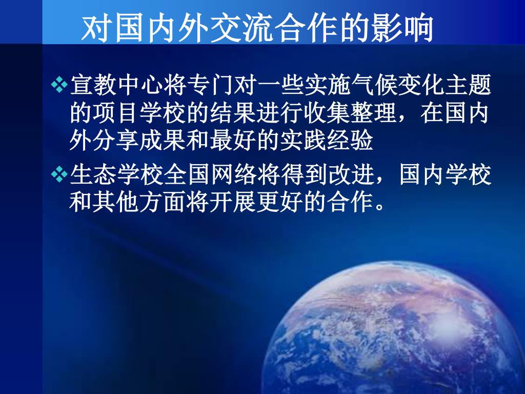 对国内外交流合作的影响 宣教中心将专门对一些实施气候变化主题的项目学校的结果进行收集整理,在国内外分享成果和最好的实践经验 生态学校全国网络将得到改进,国内学校和其他方面将开展更好的合作。