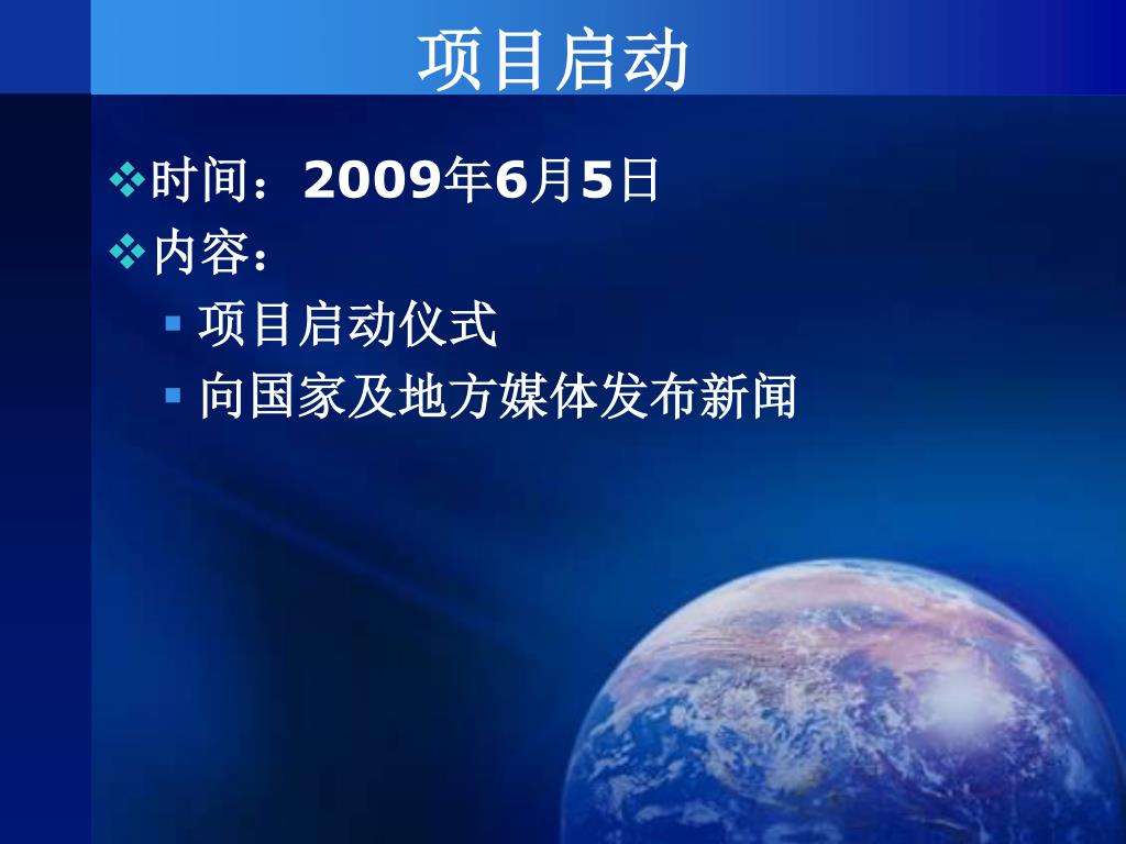 项目启动 • 时间:2009年6月5日 • 内容: • 项目启动仪式 • 向国家及地方媒体发布新闻
