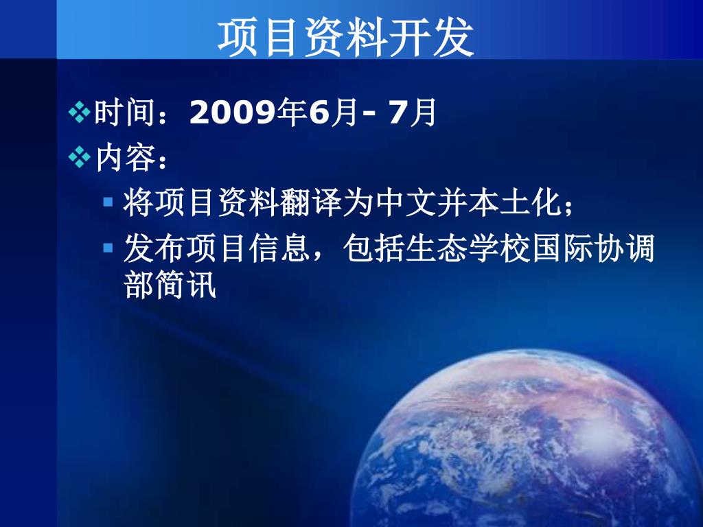 项目资料开发 • 时间:2009年6月- 7月 • 内容: • 将项目资料翻译为中文并本土化; • 发布项目信息,包括生态学校国际协调部简讯