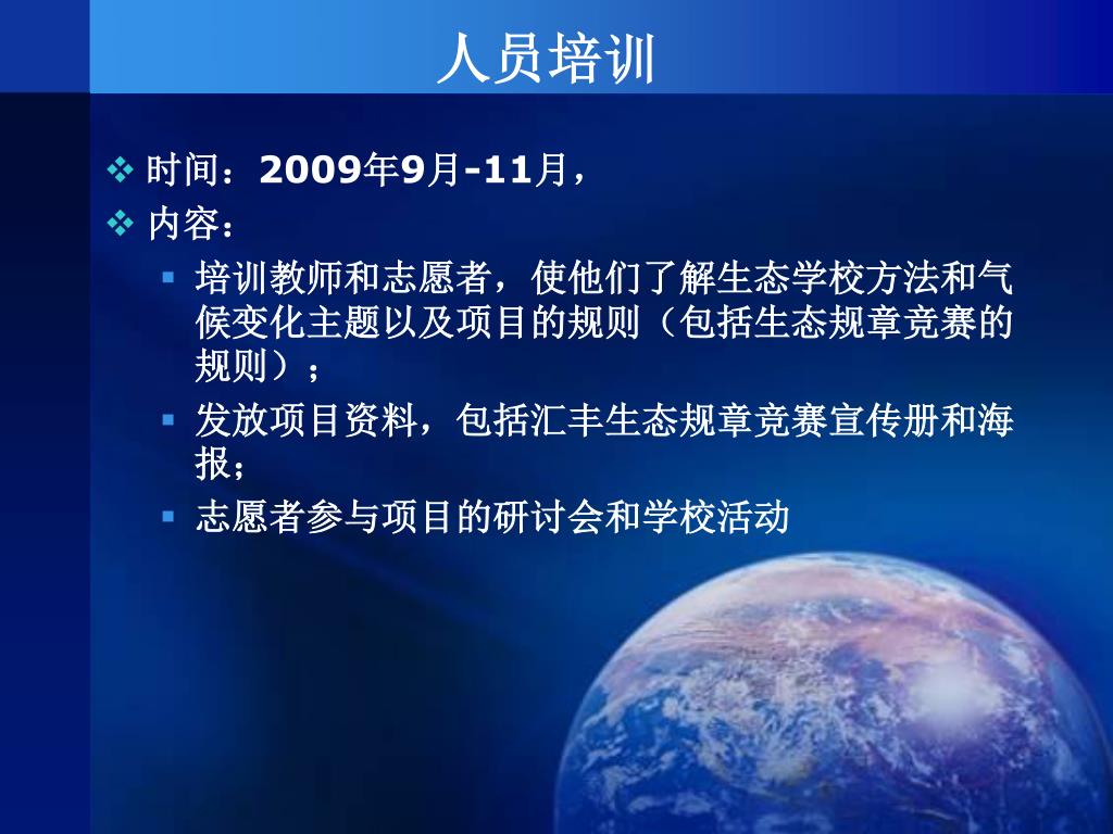 人员培训 • 时间:2009年9月-11月, • 内容: • 培训教师和志愿者,使他们了解生态学校方法和气候变化主题以及项目的规则(包括生态规章竞赛的规则); • 发放项目资料,包括汇丰生态规章竞赛宣传册和海报; • 志愿者参与项目的研讨会和学校活动