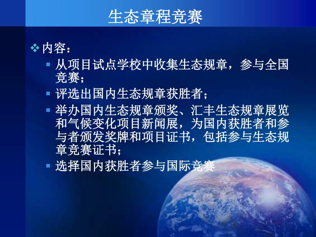 生态章程竞赛 • 内容: • 从项目试点学校中收集生态规章,参与全国竞赛; • 评选出国内生态规章获胜者; • 举办国内生态规章颁奖、汇丰生态规章展览和气候变化项目新闻展,为国内获胜者和参与者颁发奖牌和项目证书,包括参与生态规章竞赛证书; • 选择国内获胜者参与国际竞赛