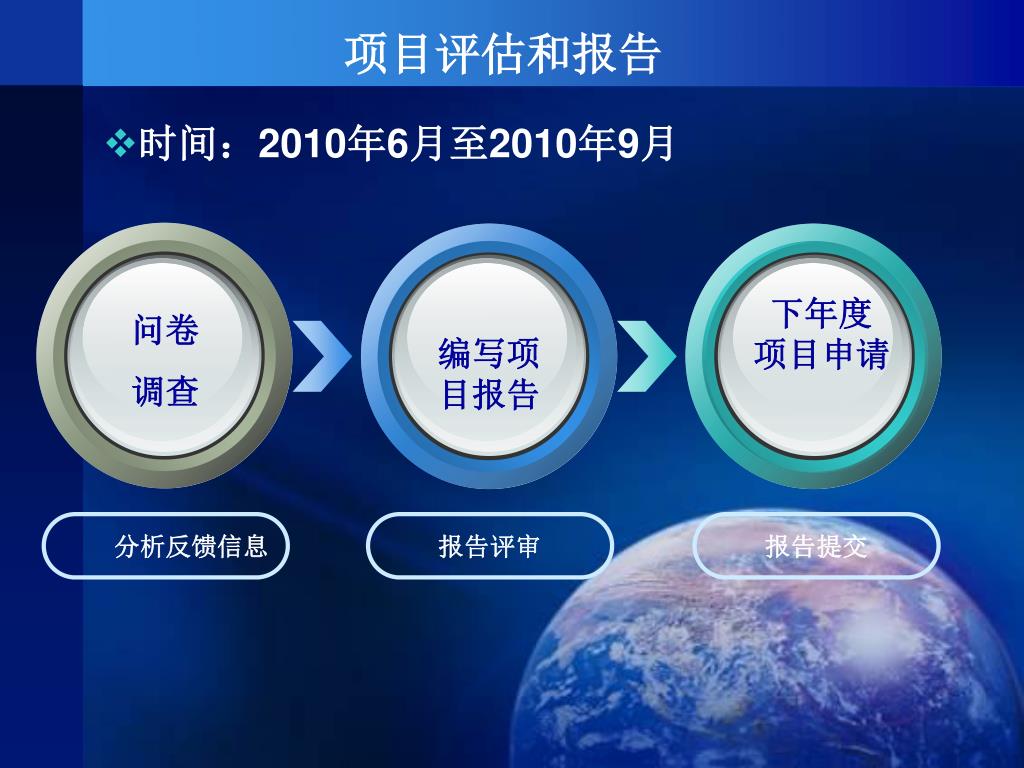 编写项 目报告 • 分析反馈信息 报告评审 报告提交 项目评估和报告 • 时间:2010年6月至2010年9月 下年度 项目申请 问卷 调查