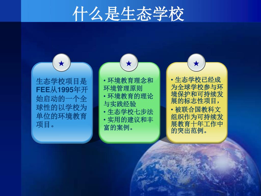★ ★ ★ 生态学校项目是FEE从1995年开始启动的一个全球性的以学校为单位的环境教育项目。 • 环境教育理念和环境管理原则 • 环境教育的理论与实践经验 • 生态学校七步法 • 实用的建议和丰富的案例。 • 生态学校已经成为全球学校参与环境保护和可持续发展的标志性项目, • 被联合国教科文组织作为可持续发展教育十年工作中的突出范例。 什么是生态学校