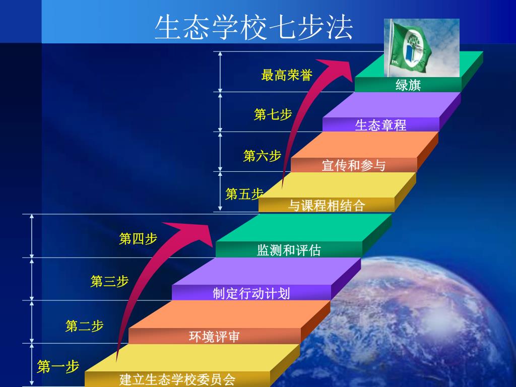 最高荣誉 第四步 监测和评估 绿旗 第七步 第三步 制定行动计划 生态章程 第六步 第二步 环境评审 宣传和参与 第一步 第五步 建立生态学校委员会 与课程相结合 生态学校七步法