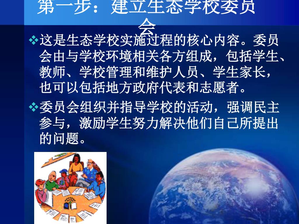 第一步:建立生态学校委员会 • 这是生态学校实施过程的核心内容。委员会由与学校环境相关各方组成,包括学生、教师、学校管理和维护人员、学生家长,也可以包括地方政府代表和志愿者。 • 委员会组织并指导学校的活动,强调民主参与,激励学生努力解决他们自己所提出的问题。