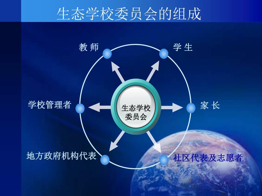 教 师 学 生 学校管理者 家 长 生态学校 委员会 地方政府机构代表 社区代表及志愿者 生态学校委员会的组成