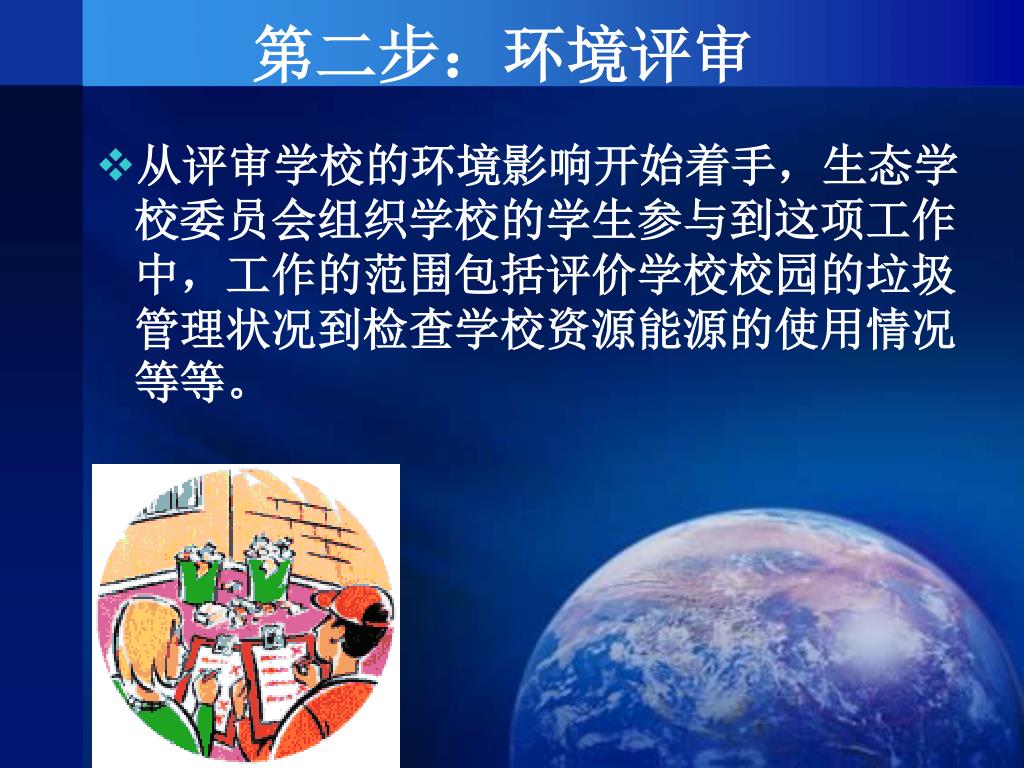 第二步:环境评审 从评审学校的环境影响开始着手,生态学校委员会组织学校的学生参与到这项工作中,工作的范围包括评价学校校园的垃圾管理状况到检查学校资源能源的使用情况等等。