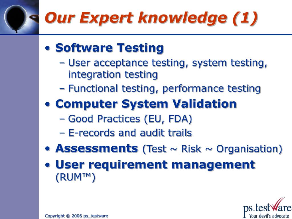 Our Expert knowledge (1) • Software Testing • User acceptance testing, system testing, integration testing • Functional testing, performance testing • Computer System Validation • Good Practices (EU, FDA) • E-records and audit trails • Assessments (Test ~ Risk ~ Organisation) • User requirement management (RUM™)
