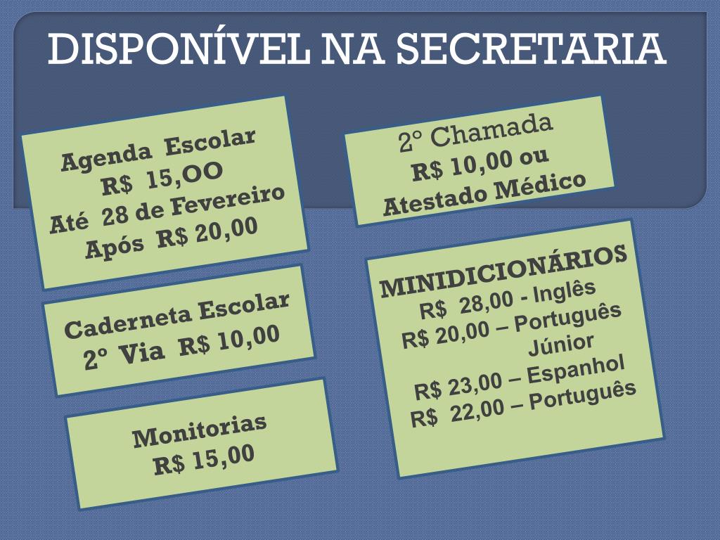DISPONÍVEL NA SECRETARIA 2º Chamada R$ 10,00 ou Atestado Médico Agenda Escolar R$ 15,OO Até 28 de Fevereiro Após R$ 20,00 MINIDICIONÁRIOS R$ 28,00 - Inglês R$ 20,00 – Português Júnior R$ 23,00 – Espanhol R$ 22,00 – Português Caderneta Escolar 2º Via R$ 10,00 Monitorias R$ 15,00