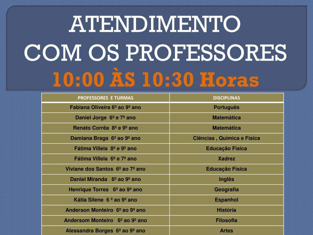 ATENDIMENTO COM OS PROFESSORES 10:00 ÀS 10:30 Horas