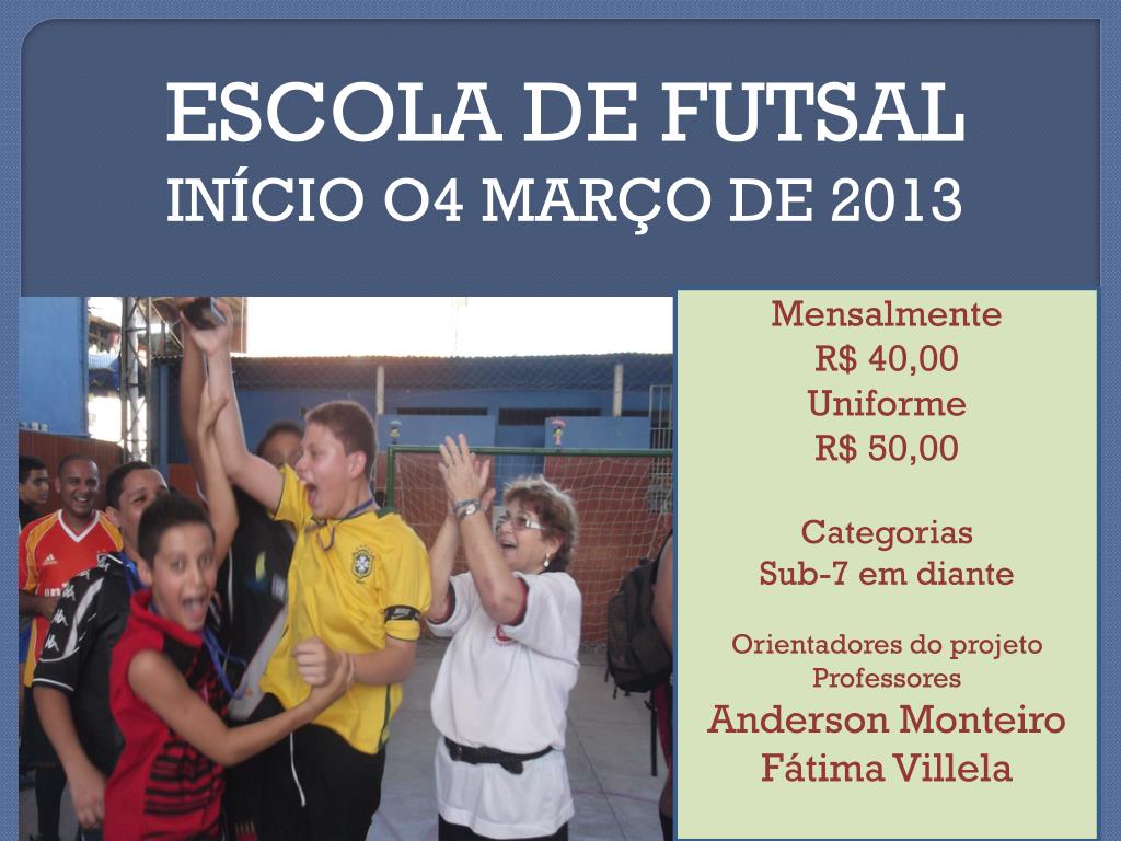 ESCOLA DE FUTSAL INÍCIO O4 MARÇO DE 2013 Mensalmente R$ 40,00 Uniforme R$ 50,00 Categorias Sub-7 em diante Orientadores do projeto Professores Anderson Monteiro Fátima Villela