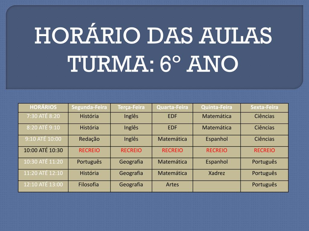 HORÁRIO DAS AULAS TURMA: 6º ANO