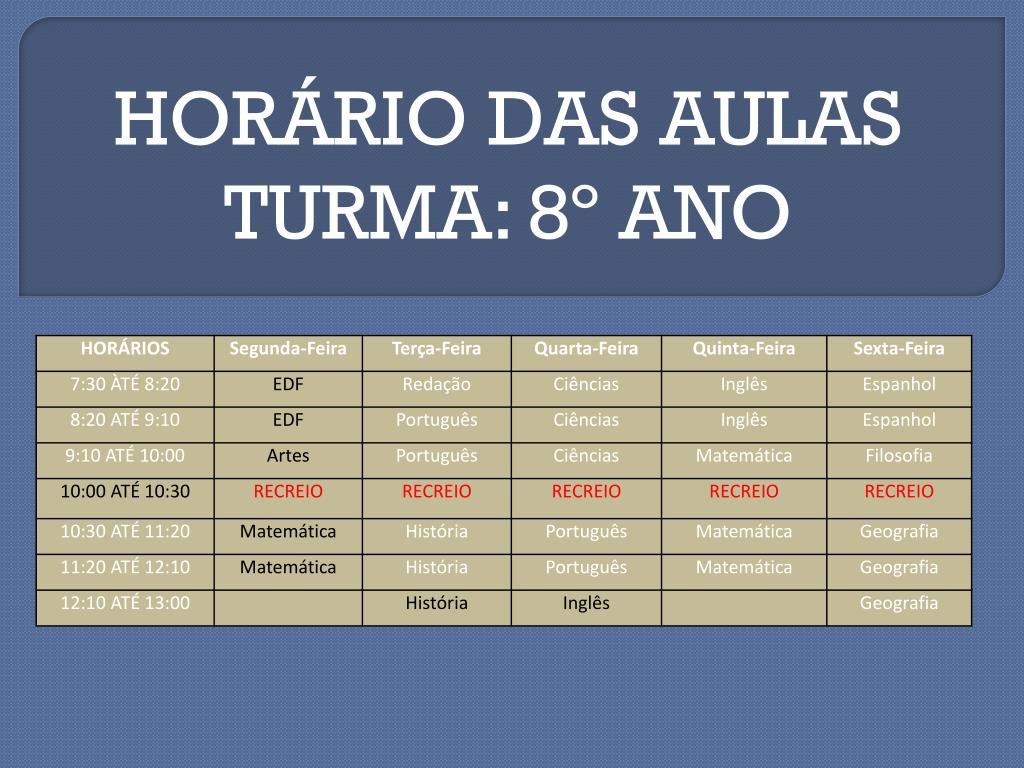 HORÁRIO DAS AULAS TURMA: 8º ANO