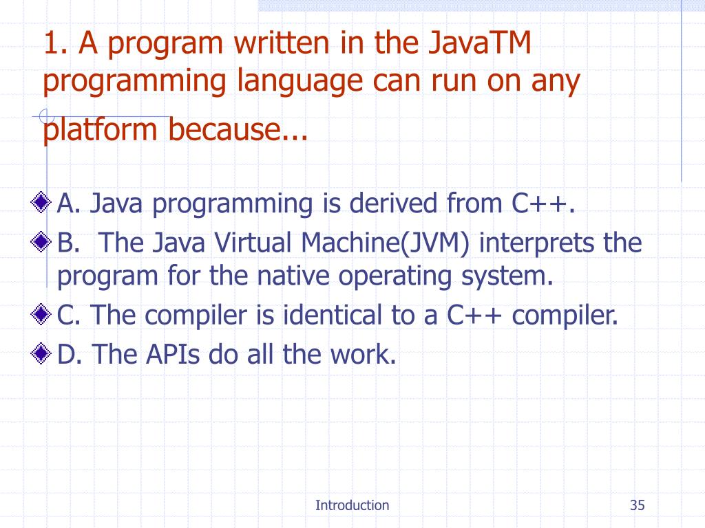 1. A program written in the JavaTM programming language can run on any platform because... • A. Java programming is derived from C++. • B. The Java Virtual Machine(JVM) interprets the program for the native operating system. • C. The compiler is identical to a C++ compiler. • D. The APIs do all the work. Introduction