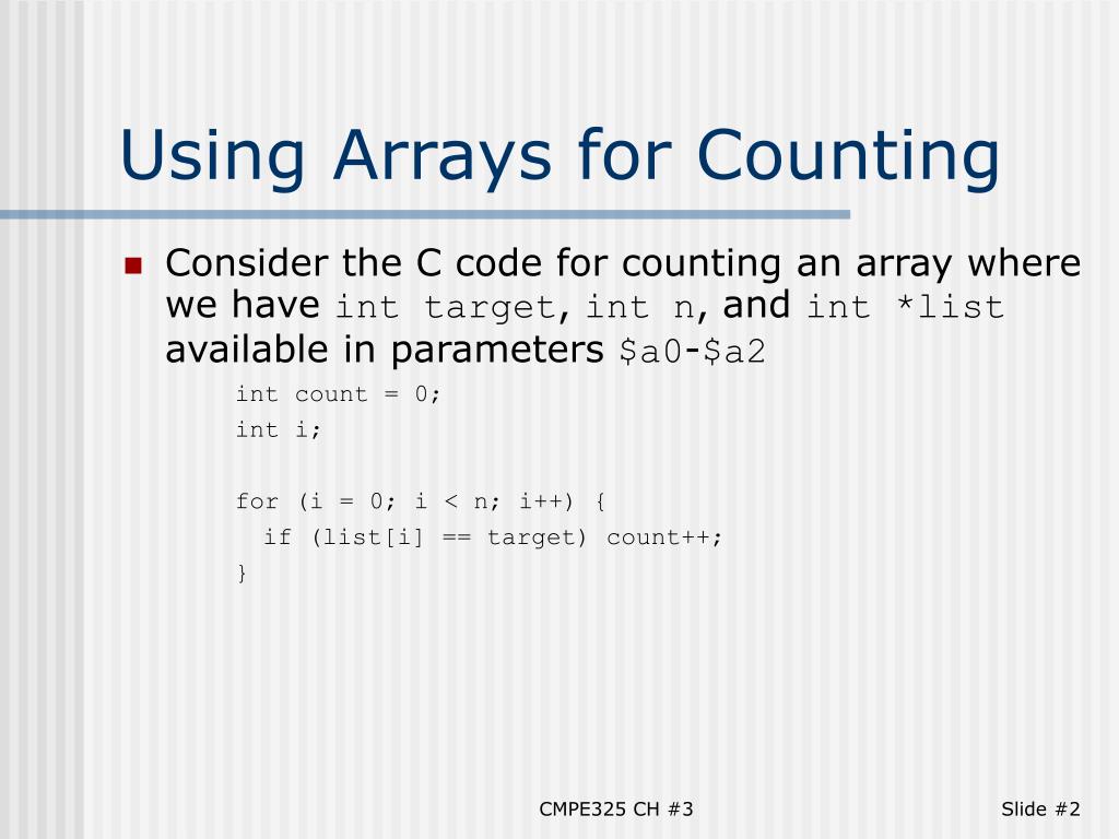 CMPE 3 2 5 Computer Architecture II. Cem Erg ün Eastern Med iterranean University. Using Assembly. Using Arrays for Counting. Consider the C code for counting an array where we have int target , int n , and int *list available in parameters $a0 - $a2 int count = 0; int i;