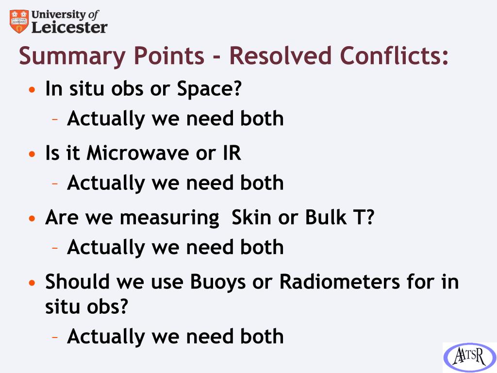 Summary Points - Resolved Conflicts: • In situ obs or Space? • Actually we need both • Is it Microwave or IR • Actually we need both • Are we measuring Skin or Bulk T? • Actually we need both • Should we use Buoys or Radiometers for in situ obs? • Actually we need both • Is it the