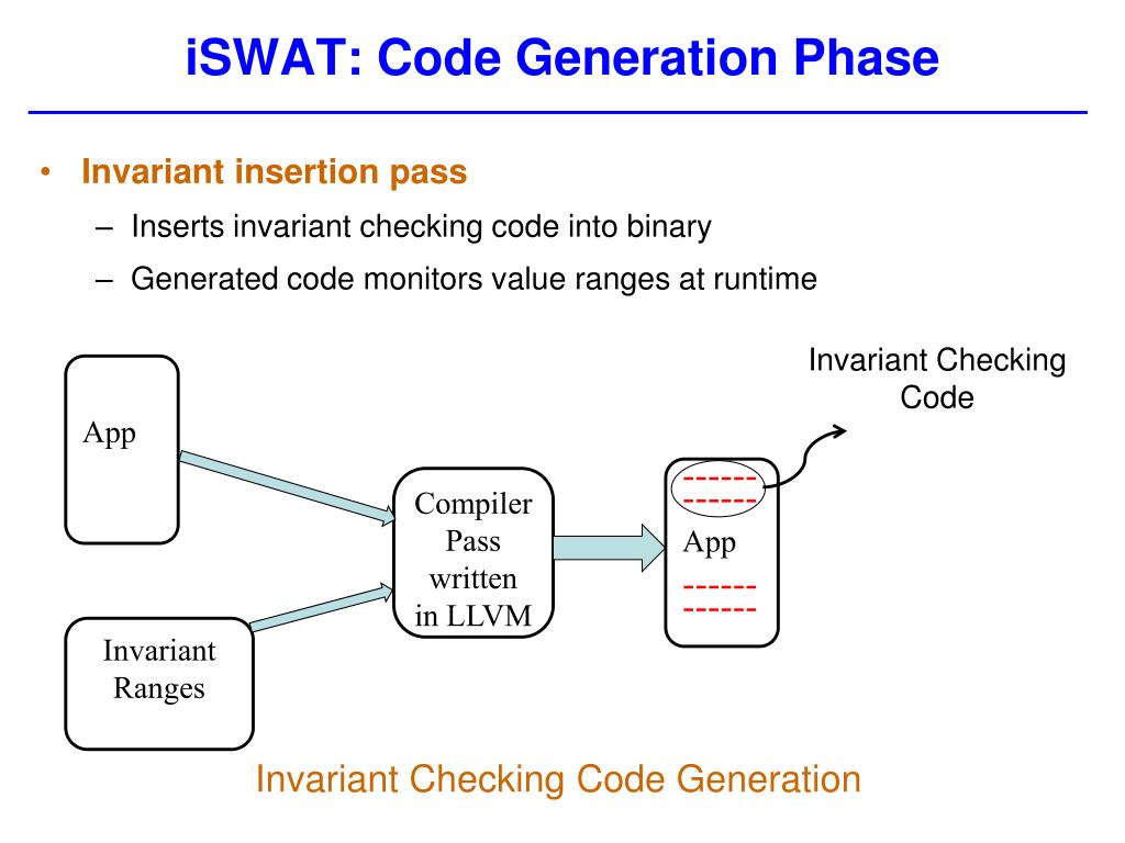 iSWAT: Code Generation Phase • Invariant insertion pass • Inserts invariant checking code into binary • Generated code monitors value ranges at runtime Invariant Checking Code App ------ ------ App ------ ------ Compiler Pass written in LLVM Invariant Ranges Invariant Checking Code Generation
