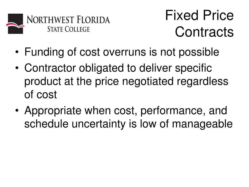 Fixed Price Contracts • Funding of cost overruns is not possible • Contractor obligated to deliver specific product at the price negotiated regardless of cost • Appropriate when cost, performance, and schedule uncertainty is low of manageable