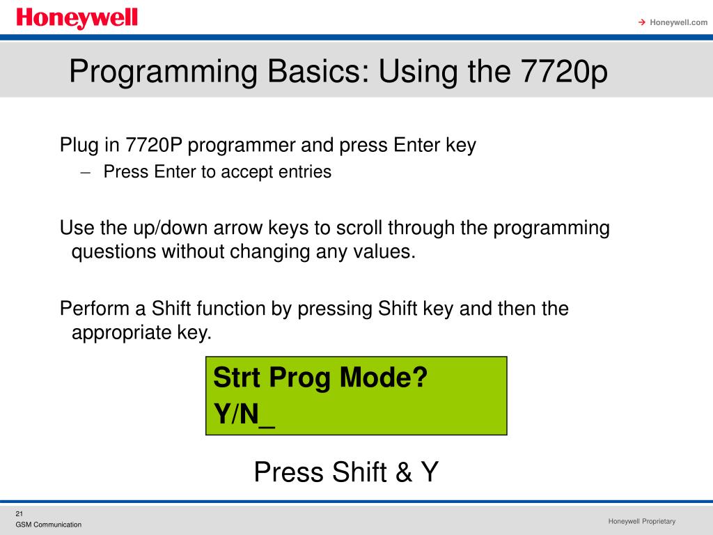 Programming Basics: Using the 7720p Plug in 7720P programmer and press Enter key • Press Enter to accept entries Use the up/down arrow keys to scroll through the programming questions without changing any values. Perform a Shift function by pressing Shift key and then the appropriate key. Strt Prog Mode? Y/N_ Press Shift & Y