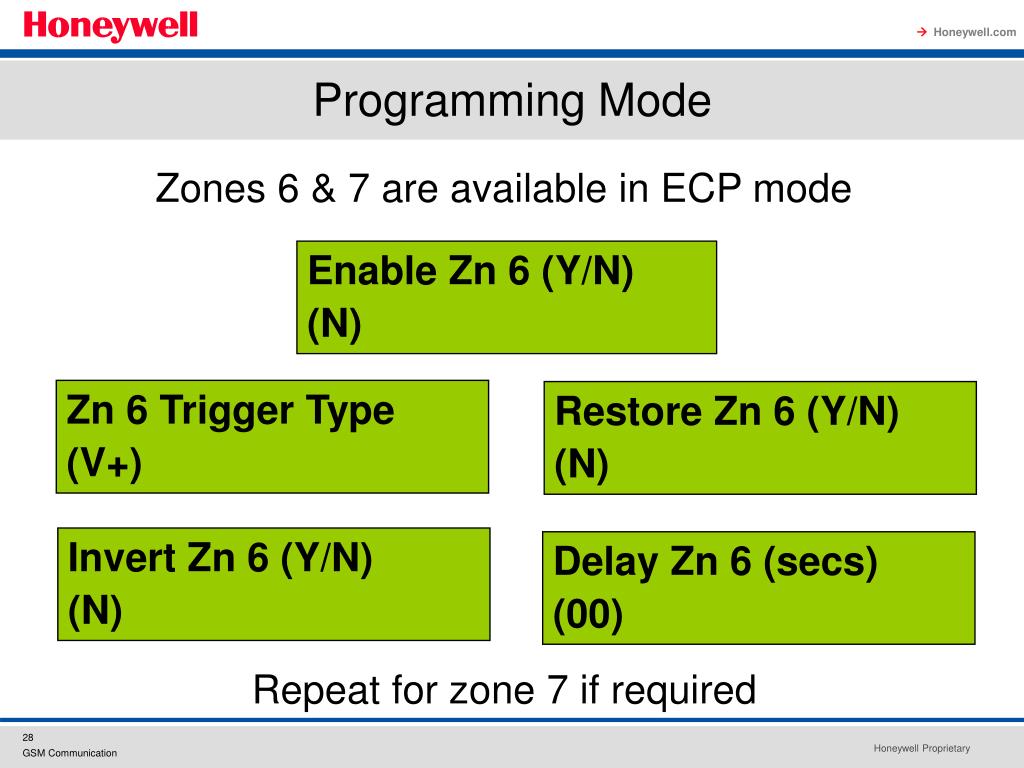 Programming Mode Zones 6 & 7 are available in ECP mode Enable Zn 6 (Y/N) (N) Zn 6 Trigger Type (V+) Restore Zn 6 (Y/N) (N) Invert Zn 6 (Y/N) (N) Delay Zn 6 (secs) (00) Repeat for zone 7 if required