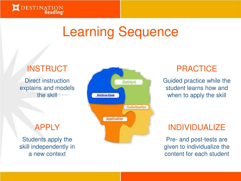 Learning Sequence INSTRUCT Direct instruction explains and models the skill PRACTICE Guided practice while the student learns how and when to apply the skill APPLY Students apply the skill independently in a new context INDIVIDUALIZE Pre- and post-tests are given to individualize the content for each student
