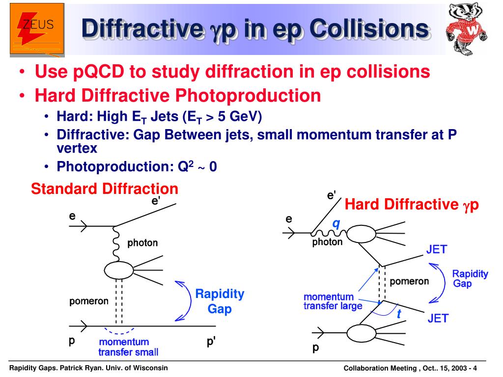 Diffractive gp in ep Collisions • Use pQCD to study diffraction in ep collisions • Hard Diffractive Photoproduction • Hard: High ET Jets (ET > 5 GeV) • Diffractive: Gap Between jets, small momentum transfer at P vertex • Photoproduction: Q2 ~ 0 Standard Diffraction Hard Diffractive gp q Rapidity Gap t