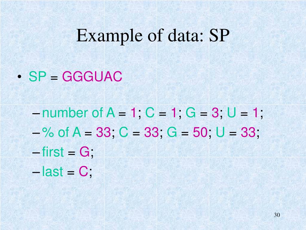 Example of data: SP • SP = GGGUAC • number of A = 1; C = 1; G = 3; U = 1; • % of A = 33; C = 33; G = 50; U = 33; • first = G; • last = C;