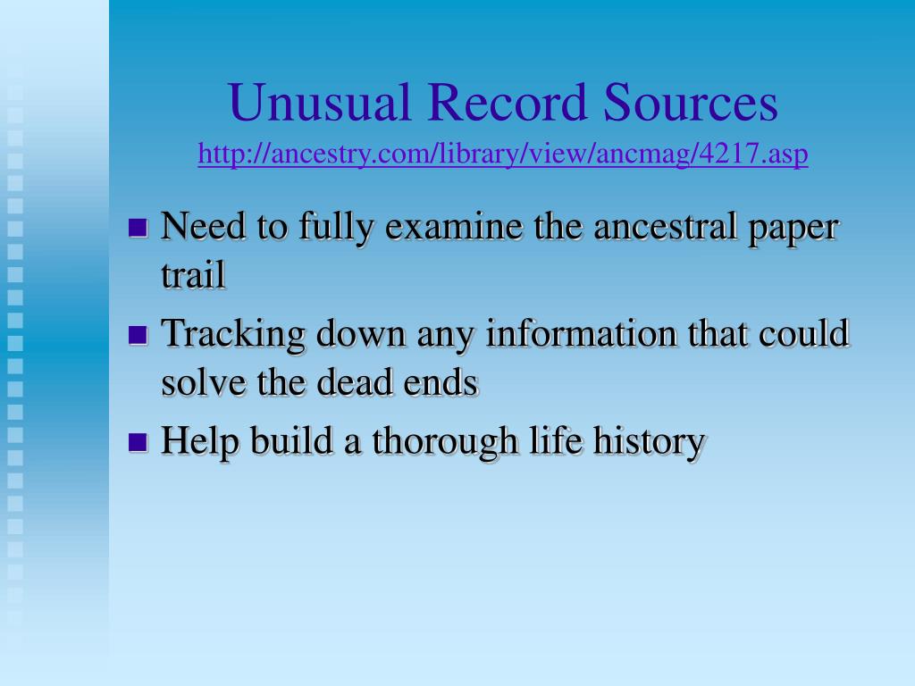 Unusual Record Sourceshttp://ancestry.com/library/view/ancmag/4217.asp • Need to fully examine the ancestral paper trail • Tracking down any information that could solve the dead ends • Help build a thorough life history
