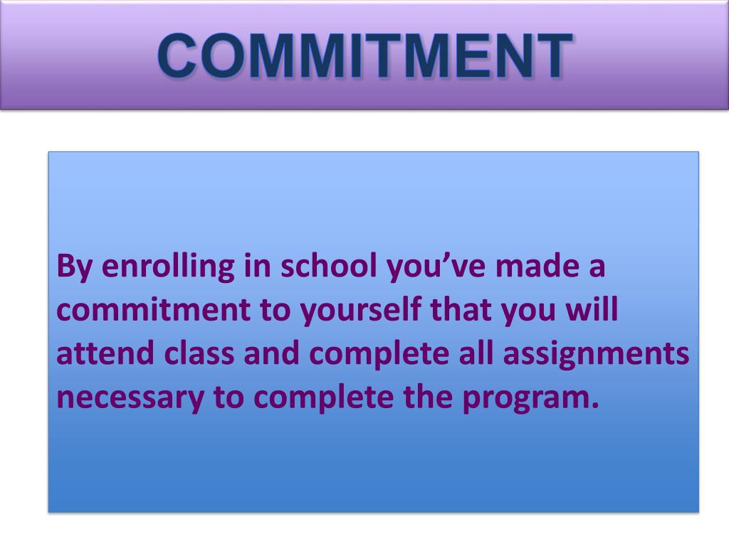COMMITMENT By enrolling in school you’ve made a commitment to yourself that you will attend class and complete all assignments necessary to complete the program.