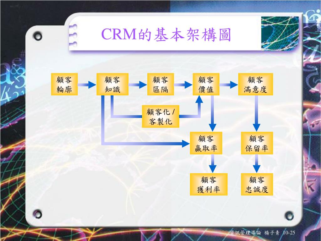 CRM之主要變數 (1) 顧客輪廓(Customer Profile) • 企業對顧客整合性資訊的蒐集,包括人口統計、消費心理特性、消費需求、消費行為模式、交易紀錄、信用等。 (2) 顧客知識(Customer Knowledge) • 與顧客有關,由資訊轉換而來(例如利用資料探勘),即一些更深、更廣、更能指導CRM的經驗法則與因果關係等。